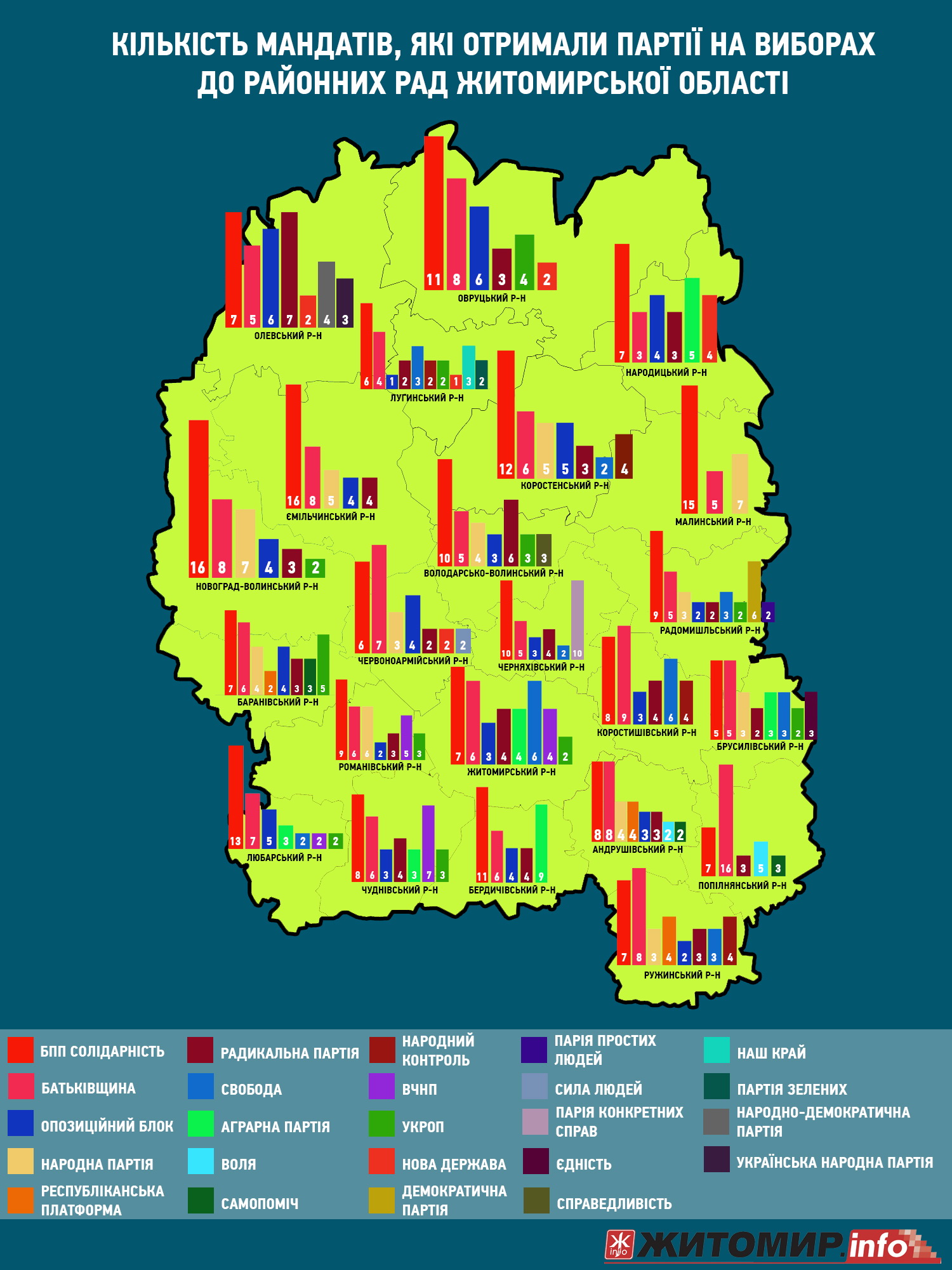 У всіх радах мають своїх представників Блок Петра Порошенка «Солідарність» та ВО «Батьківщина». Радикальна партія Олега Ляшка завела своїх депутатів у 21 райраду – крім Малинської та Любарської. Опозиційний блок отримав депутатські мандати у 20 районних радах – крім Попільнянської, Малинської та Брусилівської. Народна партія матиме своїх представників у 12 районних радах, УКРОП – в 11, ВО «Свобода» - у 9. Об’єднання «Самопоміч», яке як і вищеназвані партії провело своїх депутатів до Житомирської облради, матиме представництво лише у чотирьох райрадах – Баранівському, Попільнінському, Андрушівському та Лугинському районах.