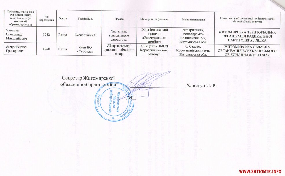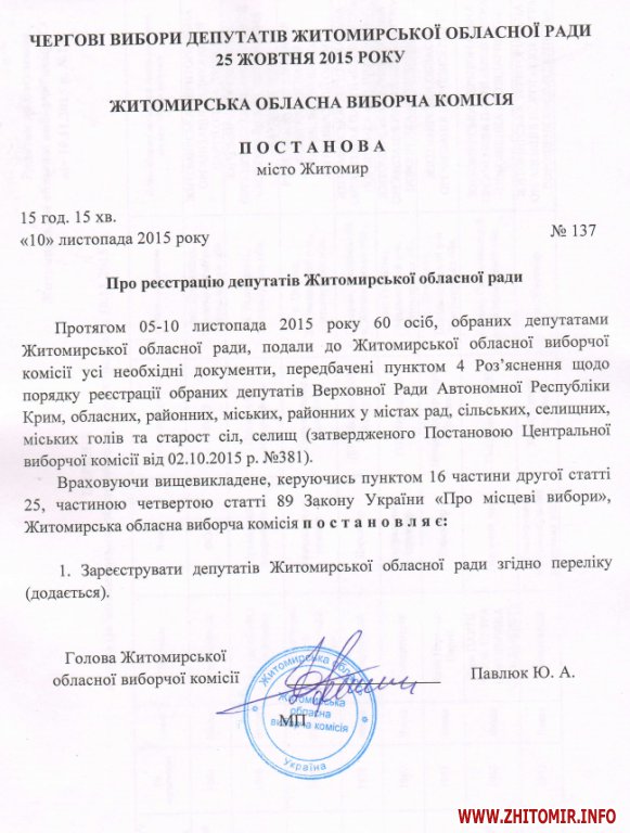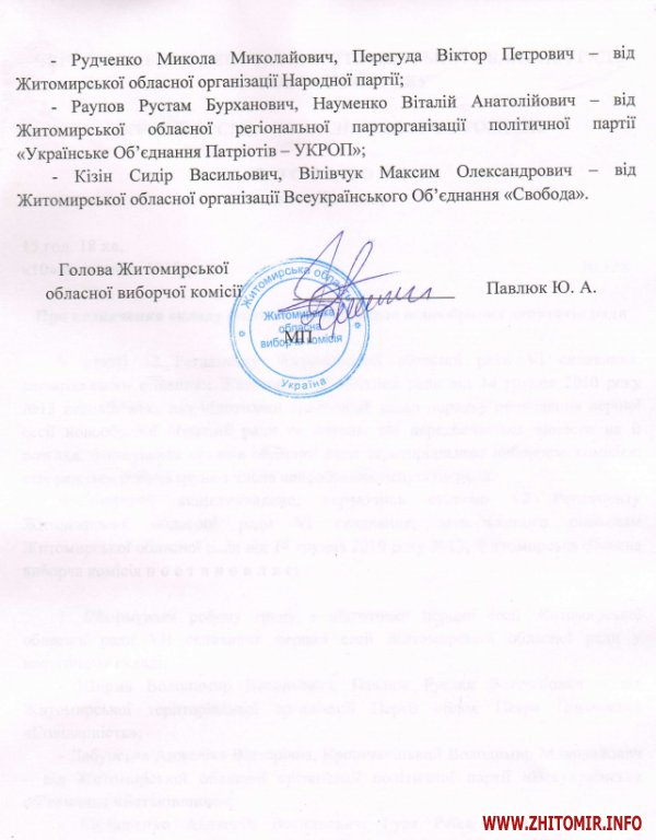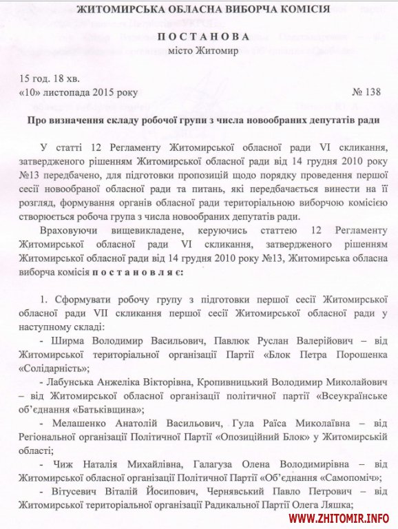 Постанови про скликання першої сесії Житомирської обласної ради VII скликання, про реєстрацію депутатів обласної ради та про визначення складу робочої групи з числа новообраних депутатів ради ввечері 10 листопада опубліковані на сайті обласної ради.