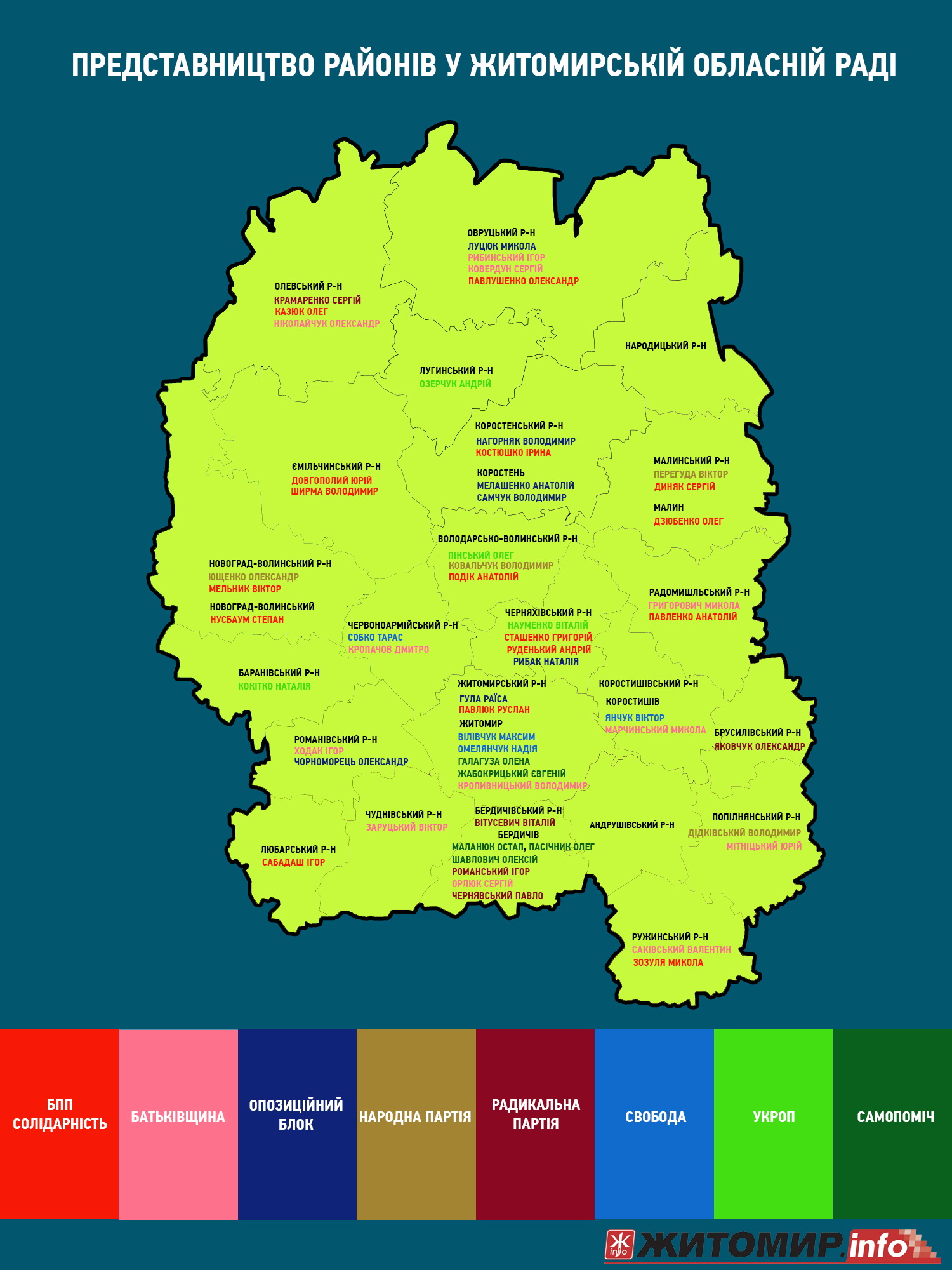 В Житомирском облсовете есть 57 депутатов, за которых голосовали избиратели в округах, и семь лидеров партийных списков: Михаил Забродский (БПП), Анжелика Лабунская («Батькивщина»), Илья Смычок (РПЛ), Виталий Эйсмонт («Самопомощь»), Николай Рудченко (Народная партия), Рустам Раупов (УКРОП) и Сидор Кизин («Свобода»).