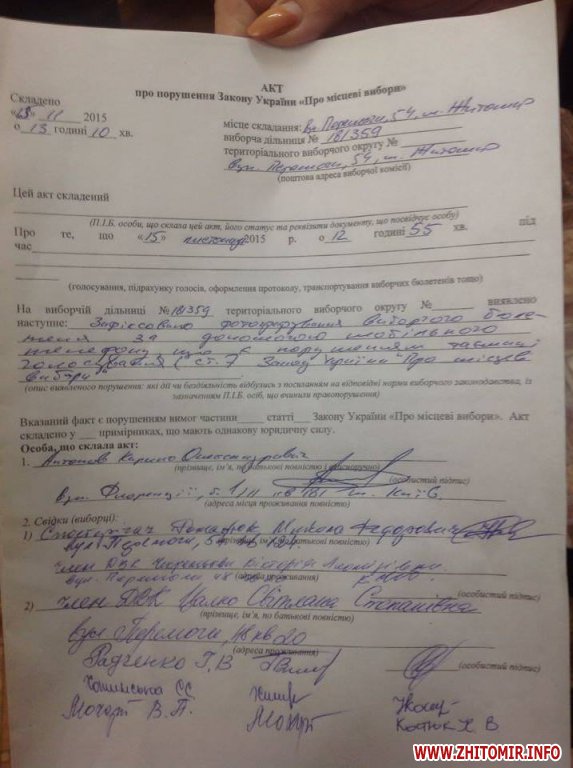 15 ноября во время голосования во втором туре выборов мэра Житомира на участке зафиксировали фотографирование бюллетеня в кабинке для голосования.