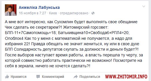 Руководитель областной организации «Батькивщины» и новоизбранный председатель облсовета Анжелика Лабунская на свой странице в фейсбук высказывает сомнения в реальности избрания Чиж секретарем горсовета, правда, в ее подсчетах есть ошибка: Батькивщина+Свобода+РПЛ - это 19 мандатов, а не 20.