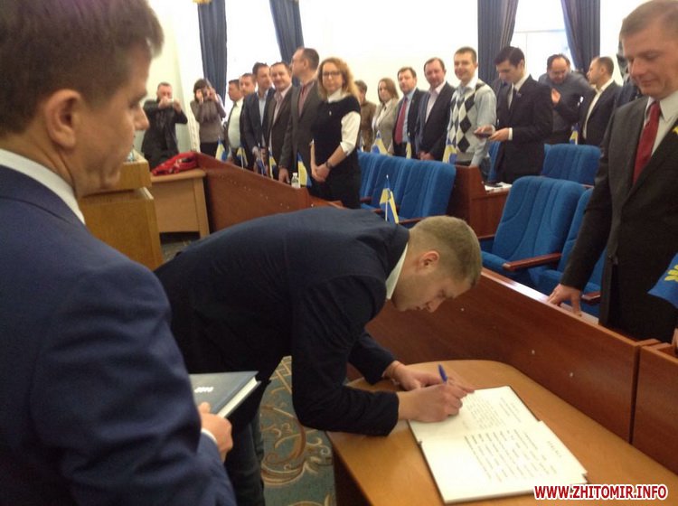 Присягу депутата зачитал самый молодой депутат горсовета – Антон Ракович («Самопомощь»). Во время чтения присяги депутата, активисты держали возле трибуны плакат "Працюй, курво".