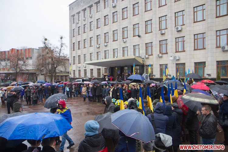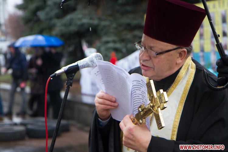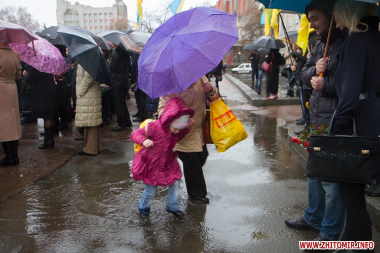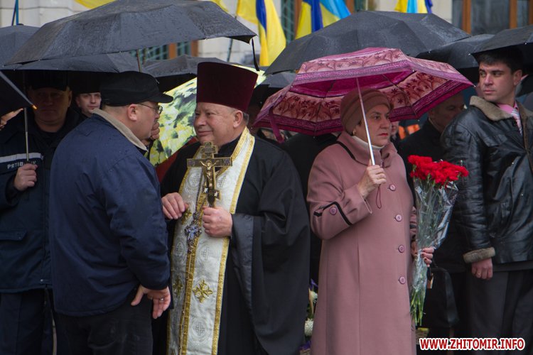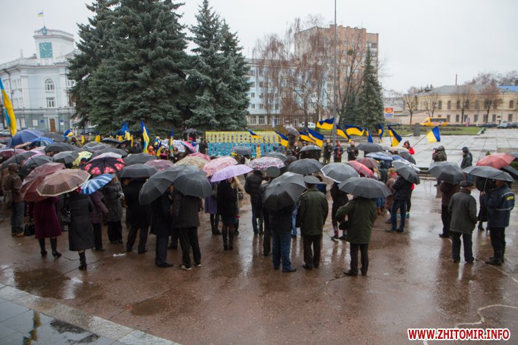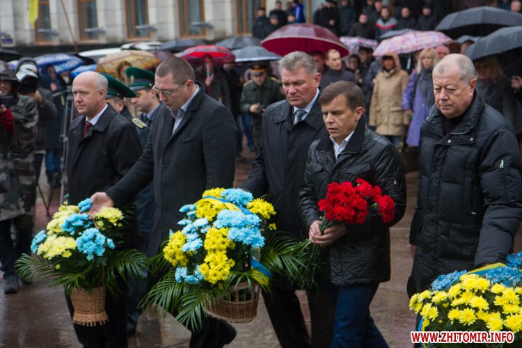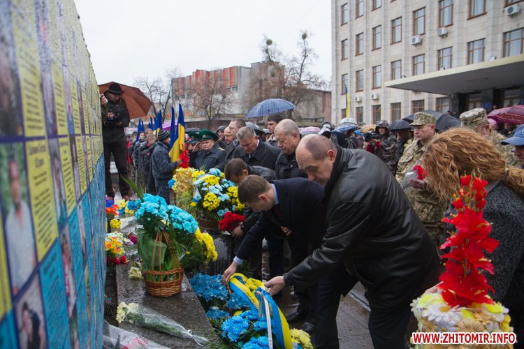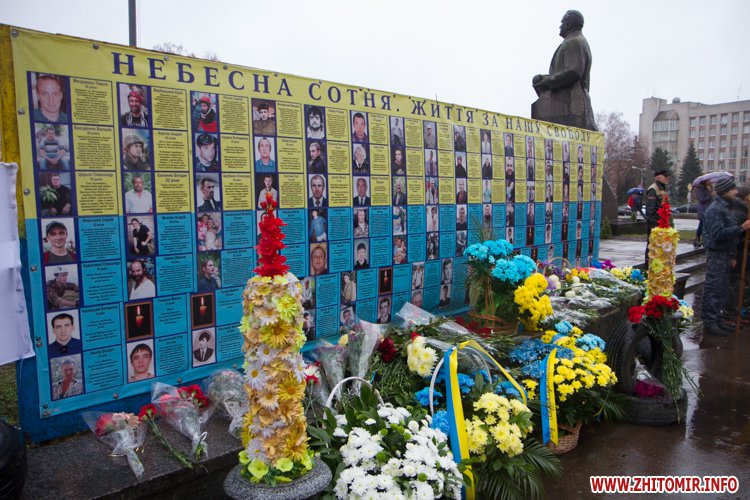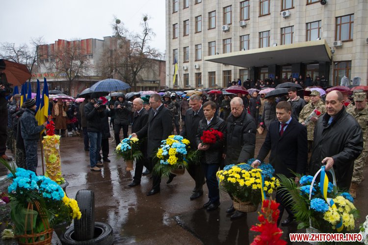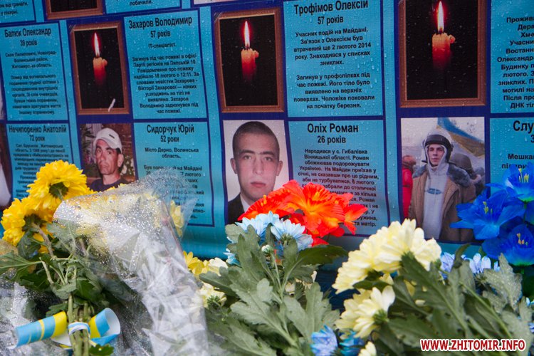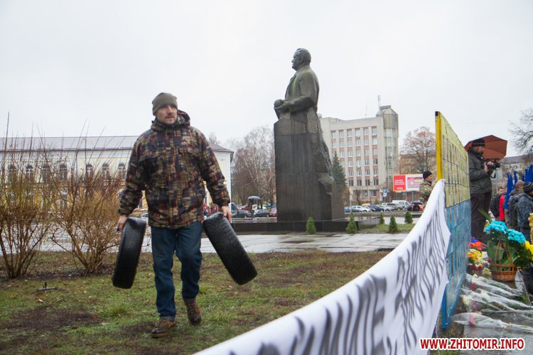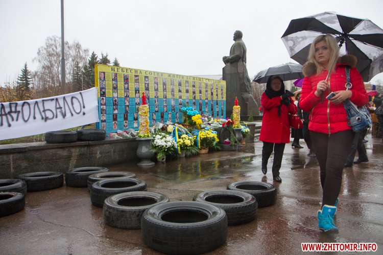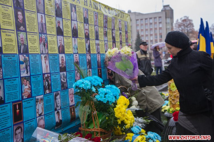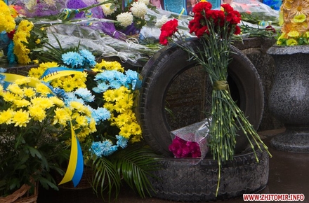 У Житомирі другу річницю початку Революції Гідності 21 листопада на майдані Корольова відзначили покладанням квітів, молитвою, виступами представників влади та шинами від активістів.