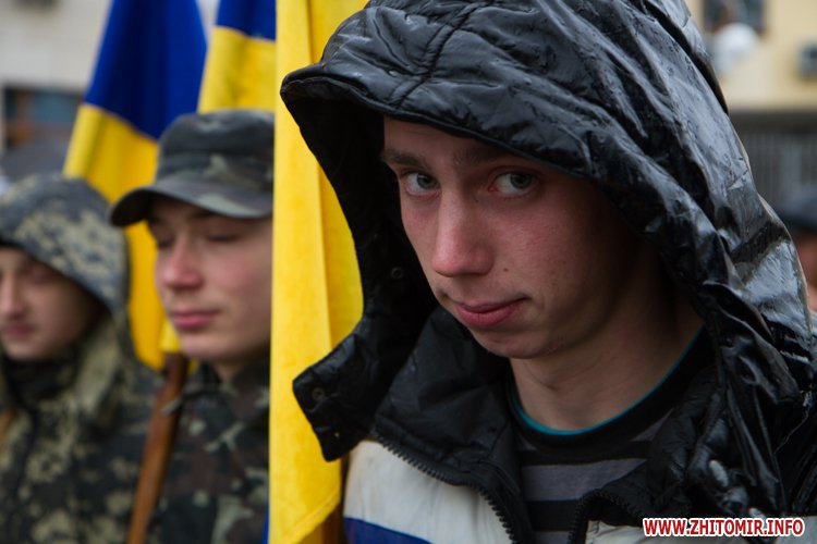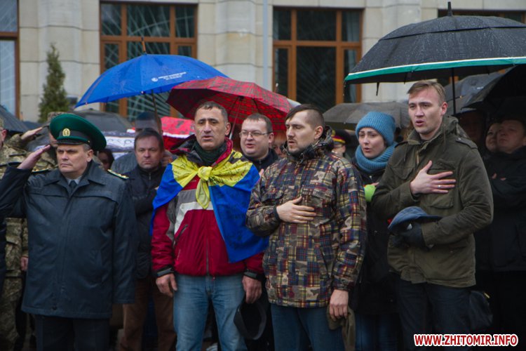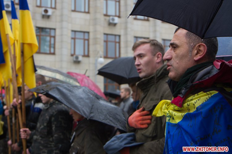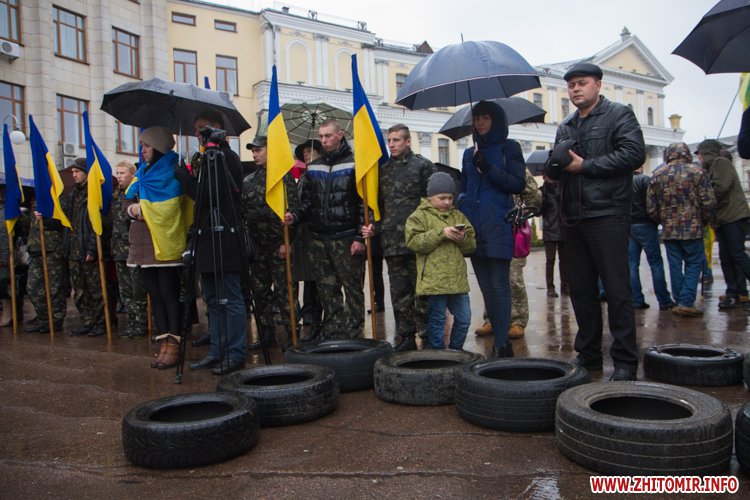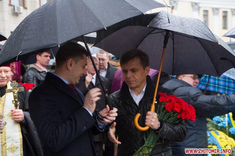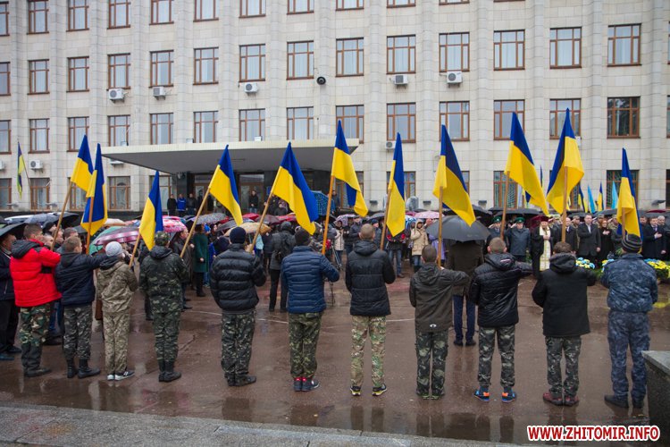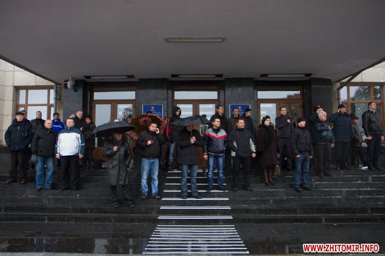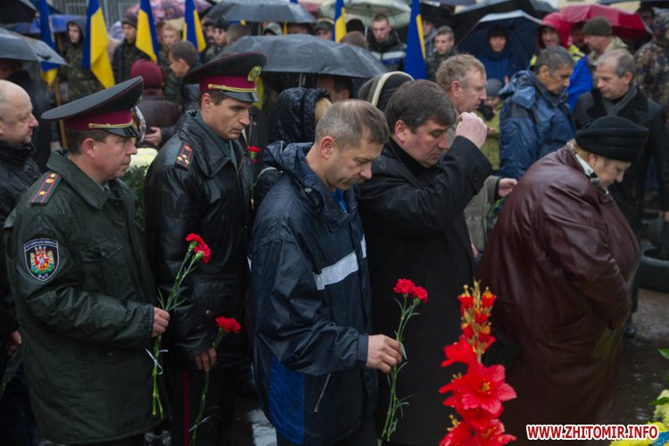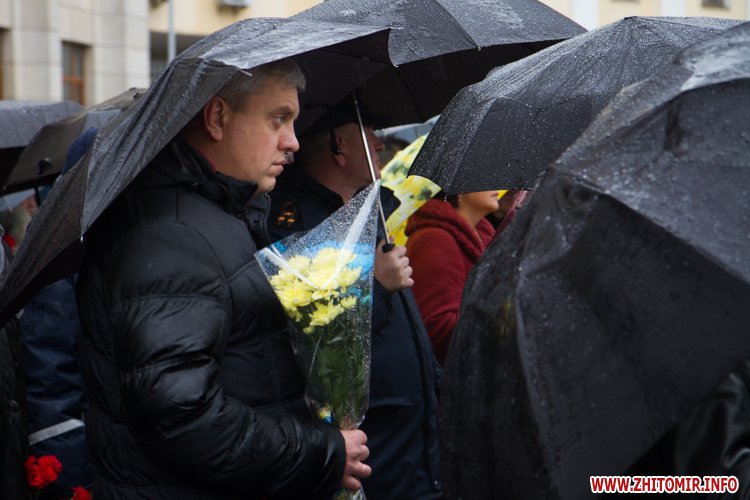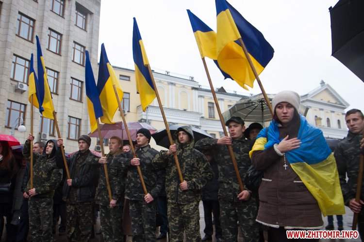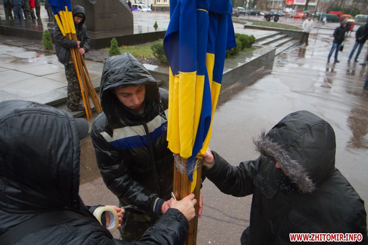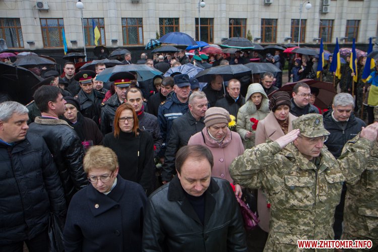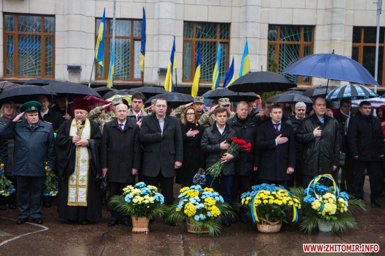 У Житомирі другу річницю початку Революції Гідності 21 листопада на майдані Корольова відзначили покладанням квітів, молитвою, виступами представників влади та шинами від активістів.