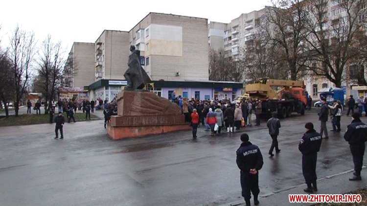 У визначений час до монументу підігнали комунальну техніку. Однак приступити до роботи одразу не вдалося – захисники пам’ятника перегородили дорогу монтажним кранам.