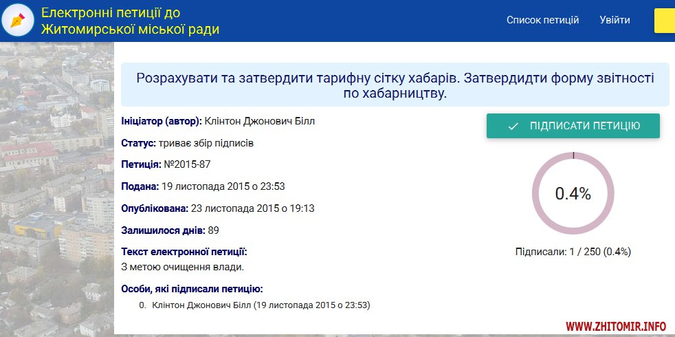 Житомирська міська рада приймає петиції і від «тролів»: ввечері 23 листопада «Електронні петиції» поповнилися зверненням, автор якого «Клінтон Джонович Білл» пропонує затвердити тарифну сітку хабарів та форму звітності по хабарництву.
