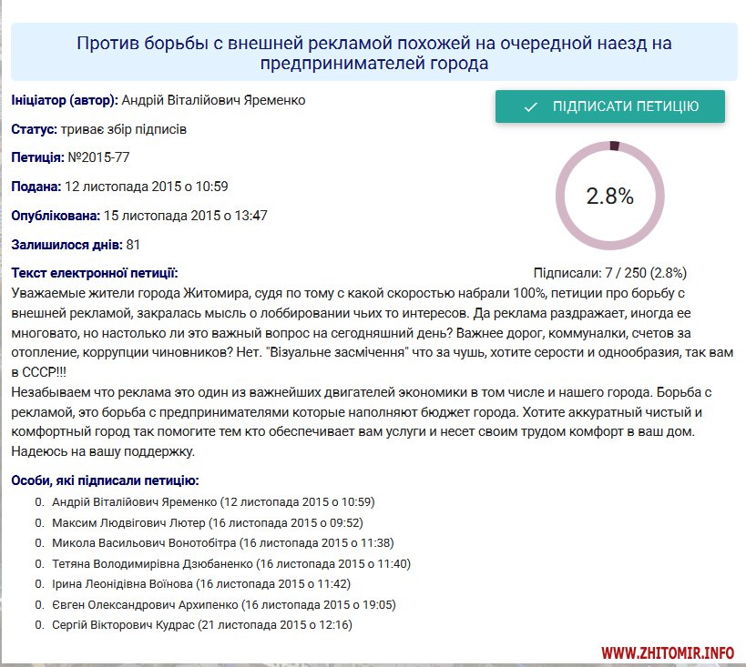До речі, зареєстрована і петиція на захист зовнішньої реклами, її автор - Андрій Віталійович Яременко. Він же пропонує надати можливість «голосувати проти петиції».