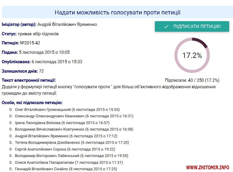 Як повідомляв Житомир.info, електронні петиції Житомирська міська рада почала приймати з 3 листопада 2015 року.