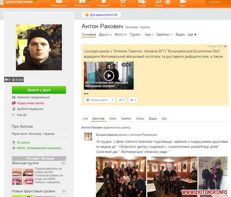 Відсутня дата останнього візиту на сторінці наймолодшого депутата міської ради Антона Раковича. В статусі, опублікованому 12 листопада 2014 року, зазначено: «Сьогодні разом з Тетяною Тимочко, головою ВГО "Всеукраїнська Екологічна Ліга", відвідали Житомирський військовий госпіталь та доставили дефіцитні ліки, а також привезли пораненим військовим екологічно чистий мед з Дніпропетровщини».