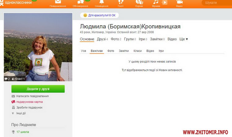 Людмила Кропивницька востаннє була на сторінці 27 вересня 2008 р. Має 4 друга.