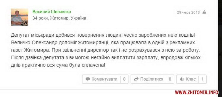 «Депутат міськради добився повернення людині чесно зароблених нею коштів! Величко Олександр допоміг житомирянці, яка працювала в одній з рекламних газет Житомира. При звільненні директор так і не розрахувався з нею за роботу. Після дзвінка депутата з вимогою негайно виплатити зарплату, впродовж кількох днів практично вся сума була сплачена!», – зазначено в статусі.