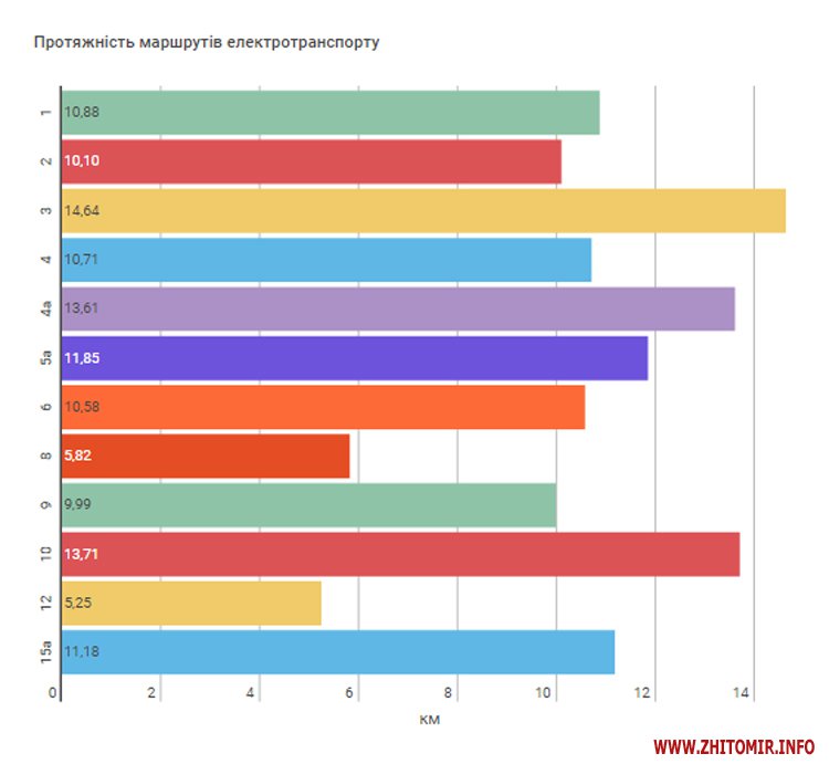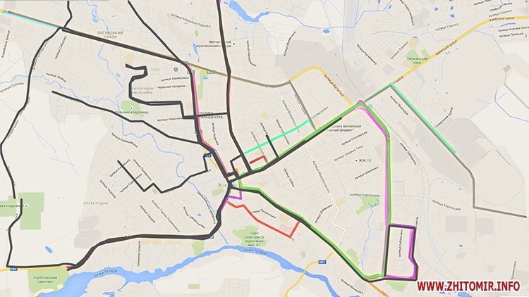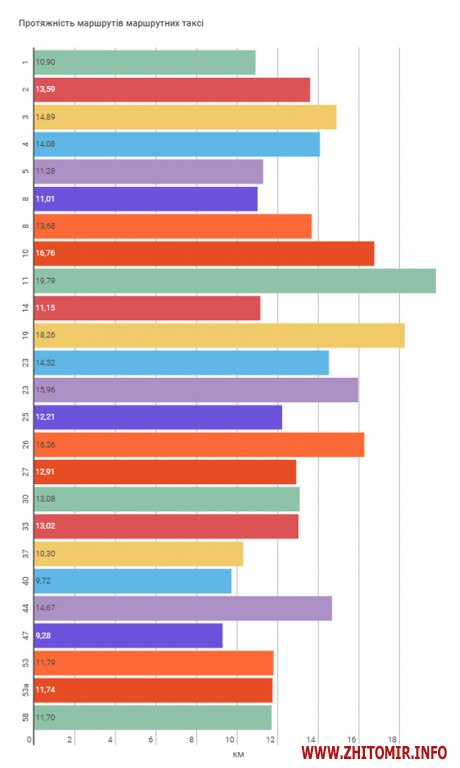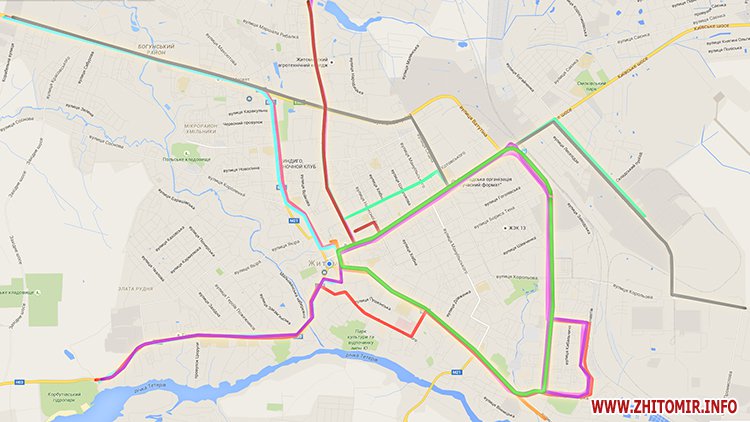 Щоденно у години-пік на вулиці Житомира виїжджає 90 тролейбусів, 12 трамваїв і 220 міських маршруток. Поглянемо на нову мережу міських автобусних маршрутів, які у травні затвердив виконавчий комітет Житомирської міської ради. Практично усі маршрутки курсують центральними вулицями міста і дублюють маршрути електротранспорту. Додатково автобусні маршрути працюють у районах, не покритих електротранспортом, і їх протяжність більша. Найдовший автобусний маршрут №11 сягає майже 20-ти кілометрів, це на 5 кілометрів більше, ніж протяжність найдовшого тролейбусного маршруту «трійки».