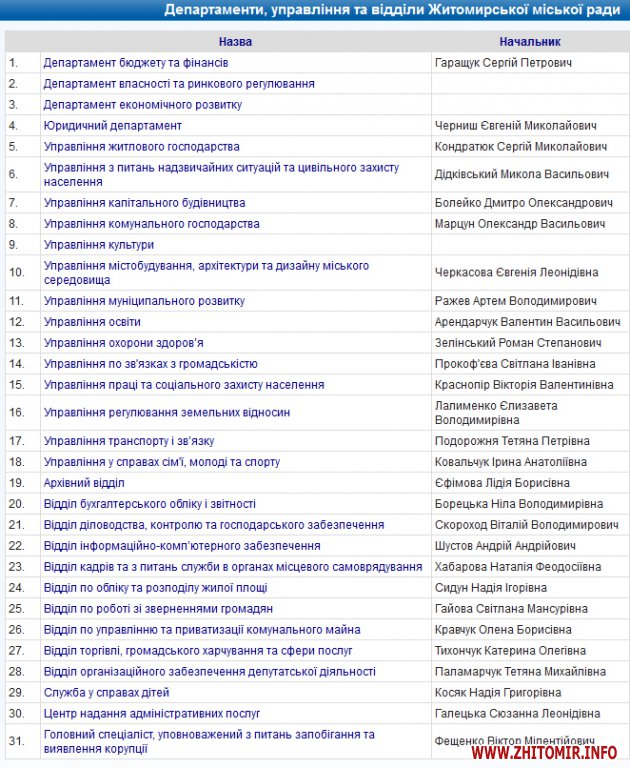 Керівники підрозділів Житомирської міської ради станом на 9 грудня 2015 року