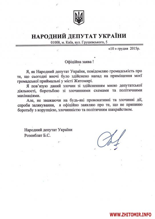 В Житомире в ночь с 9 на 10 декабря неизвестные напали на офис фирмы «Фаворит» по ул. Витрука, 6, в котором находится общественная приемная народного депутата Борислава Розенблата.