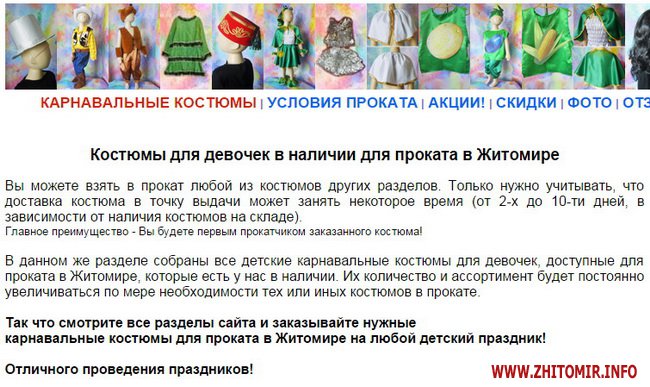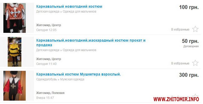 Купити готовий костюм у Житомирі коштує доволі дорого. Зокрема, ціни на плаття «сніжинок» та принцес у супермаркетах варіюються від 170 до 750 гривень, на ринку – трохи дешевше, але здебільшого пропонується одяг напрокат. Костюми на хлопчиків можна взяти під заставу за 100-200 гривень, на дівчаток – від 150 до 350 гривень і більше. Дешевші карнавальні костюми можна придбати або взяти напрокат в інтернеті: продаж від 100 гривень, прокат – від 50 гривень. Отже, середня вартість новорічного костюма для однієї дитини у Житомирі – 300 гривень.