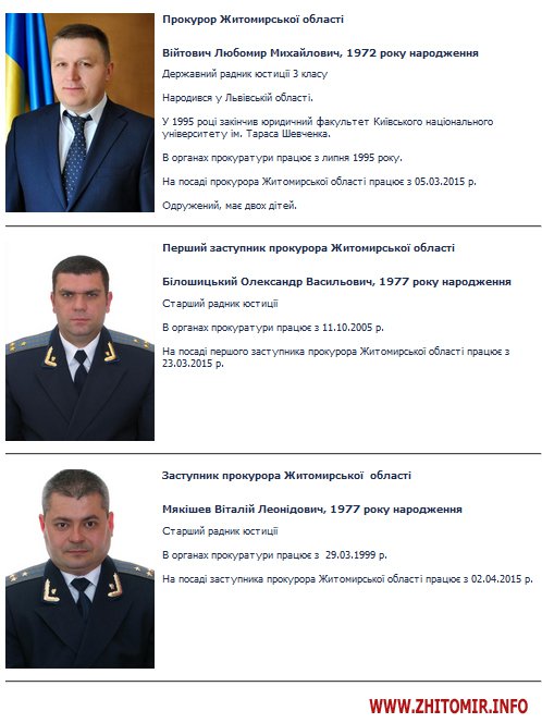 По состоянию на 10 декабря на сайте областной прокуратуры есть информация о первом заместителе прокурора – Александр Билошицкий и заместителе – Виталий Мякишев. Оба были назначены на эти должности после того, как прокуратурой Житомирской области стал руководить Вийтович.