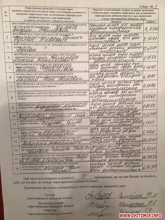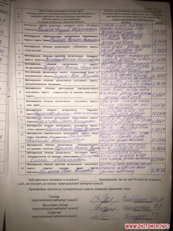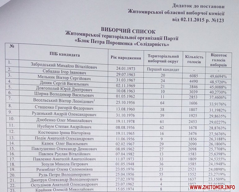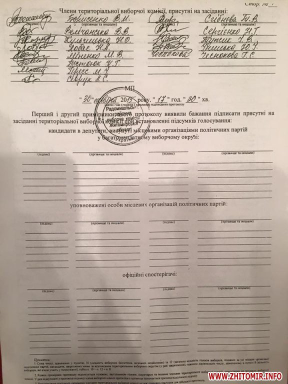 «25 октября был день выборов. В принципе, уже в ночь с 25 на 26 и октября результаты были посчитаны. 26-27- протоколы написаны , подписаны и розданы членам комиссий и наблюдателям для своих штабов. По Радомышльскому 33 округу результаты выборов выглядели следующим образом: за Павленко- 1589 голосов, или 21,5%. При подаче в ОВК 30 октября, странным образом, результаты протоколов от 27 октября изменились кардинально ... А именно, с партий, которые не преодолели 5% барьер , непонятным образом списали от 20 до 60 голосов, и 220 голосов добавили Павленко. Сначала это заметили члены Радомышльской избирательной комиссии, которые при здравом уме и памяти подписывали протокол с 21,5% и 1589 голосами... Когда членам комиссии попал в руки "уточнённый" протокол от 30 октября , где у Павленко вдруг стало 1809 голосов , 24,5 %, они изумились - их подписи были подделаны... Данный вопрос был громко озвучен на Радомышльской районной сессии представителями нескольких партий, после чего было написано обращение в правоохранительные органы», - пишет Елена Розенблат.