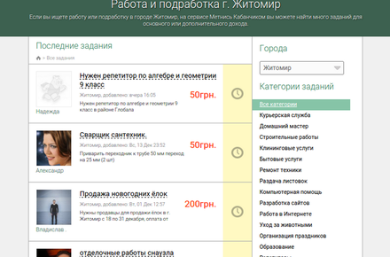 Містян, яких цікавить підробіток в Житомирі, сервіс зацікавить можливістю дуже швидкого пошуку додаткової роботи у будь-якій сфері, незважаючи на наявність чи відсутність кваліфікації та досвіду, - впевнені представники ресурсу Метнись Кабанчиком. Зокрема, зараз в Житомирі є попит на спеціалістів таких категорій: домашній майстер, кур’єр, будівельник, спеціаліст з клінінгу, репетитор, фрілансер (дизайнер, копирайтер, розробник сайтів тощо). Попит є навіть на торти на замовлення і чи виконавців, які напишуть на асфальті під вікнами будинку зізнання у коханні.