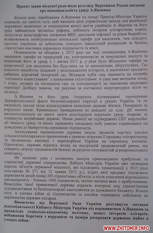 «Більше року перебування А.Яценюка на посаді Прем’єр-Міністра України показали, що замість того, щоб вживати дієві управлінські заходи для реанімації державної економіки та покращення якості життя українців А.Яценюк та його уряд займаються імітацією реформ, лобіюють інтереси олігархічних кланів, допустили катастрофічне зниження ВВП, зростання інфляції та рівня безробіття, встановлюють необґрунтовані непосильні тарифи для населення, чим доводять простих українців до зубожіння», - йдеться у проекті заяви, який роздали депутатам.