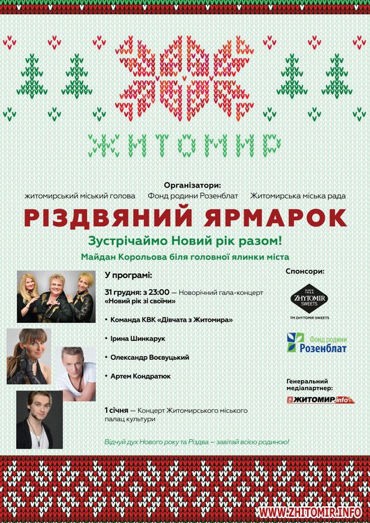 31 грудня о 23.30 всіх бажаючих запрошують на майдан Корольова у Житомирі, де в рамках Різдвяного ярмарку біля головної ялинки міста відбудеться гала-концерт «Новий рік зі своїми».