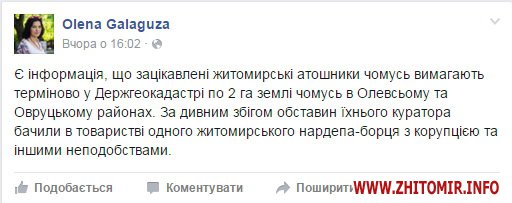 На своїй сторінці у Facebook 28 грудня Олена Галагуза написала: «Є інформація, що зацікавлені житомирські атошники чомусь вимагають терміново у Держгеокадастрі по 2 га землі чомусь в Олевсьому та Овруцькому районах. За дивним збігом обставин їхнього куратора бачили в товаристві одного житомирського нардепа-борця з корупцією та іншими неподобствами».