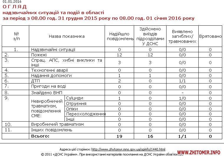 За добу, з 8 ранку 31 грудня до 8 ранку 1 січня, у Житомирській області сталося 12 пожеж, дві дорожньо-транспортні пригоди та одне самогубство.