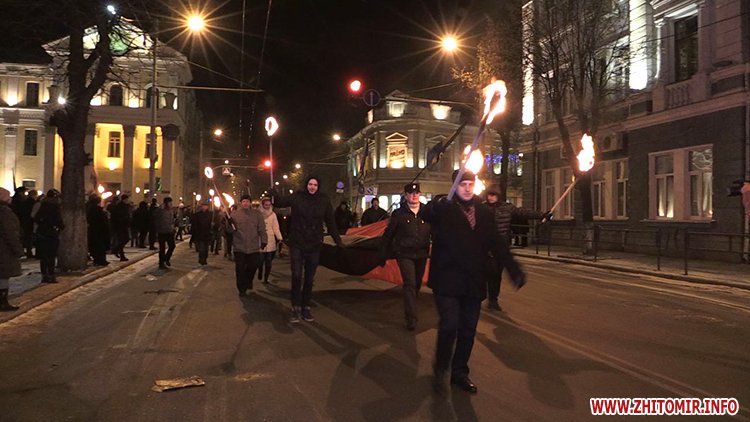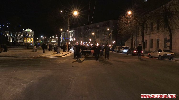 До ходи долучилося більше 50 націоналістів з факелами та червоно-чоними прапорами. Усі вони зібралися біля стели пам’яті Героям Небесної Сотні та, вигукуючи патріотичні гасла, рушили вулицею Великою Бердичівською до пам’ятника Тарасу Шевченку.