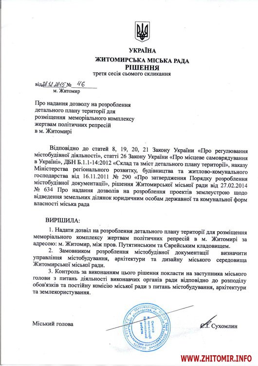«Надати дозвіл на розроблення детального плану території для розміщення меморіального комплексу жертвам політичних репресій в м. Житомирі за адресою: м. Житомир, між пров. Путятинським та Єврейським кладовищем. Замовником розроблення містобудівної документації визначити управління містобудування, архітектури та дизайну міського середовища Житомирської міської ради», - йдеться в документі, який є у розпорядженні Житомир.info.