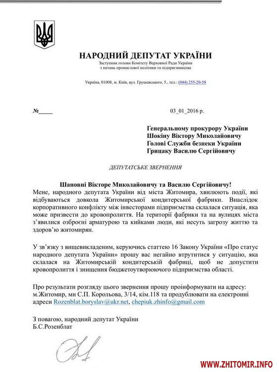 Народний депутат від Житомира Борислав Розенблат 3 січня надіслав на адресу Генерального прокурора України Віктора Шокіна та Голови Служби безпеки України Василя Грицака звернення, у якому просить втрутитися у ситуацію, яка склалася на Житомирській кондитерській фабриці.