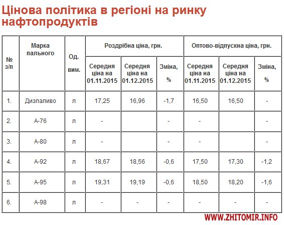 За інформацією департаменту економічного розвитку, торгівлі та міжнародного співробітництва облдержадміністрації, середні роздрібні ціни на пальне в Житомирській області станом на 1 грудня 2015 року були такими: дизпаливо – 16,96 грн; бензин А-92 – 18,56 грн; бензин А-95 – 19,19 грн.
