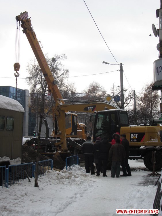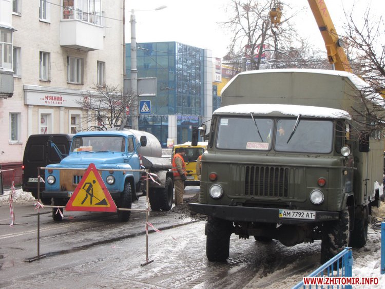 16 січня в Житомирі, на початку вулиці Черняховського, представники КП «Житомиртеплокомуненерго» ліквідовують аварію тепломережі.