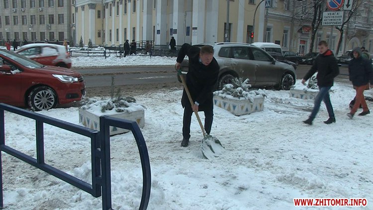 11 января в Житомире ночью выпал снег. Утром советник мэра Житомира Юрий Мойсеев собственноручно лопатой расчищал от снега Михайловскую.