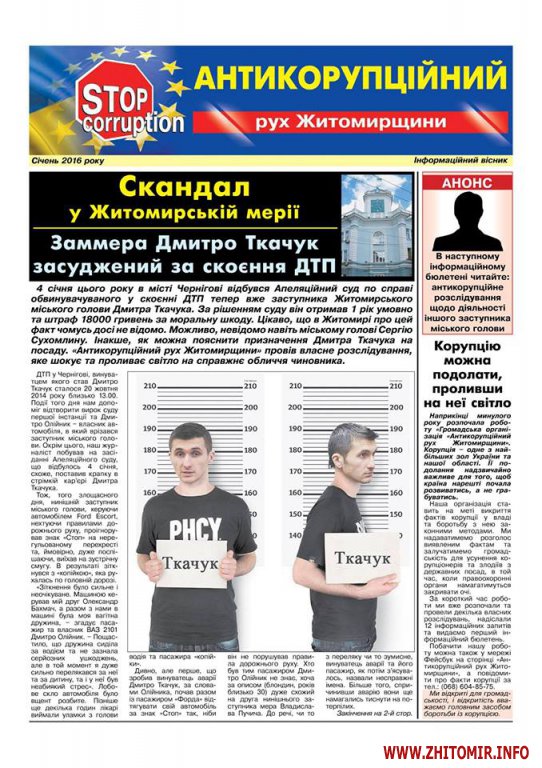 «Сьогодні громадська організація «Антикорупційний рух Житомирщини» надіслала звернення Житомирському міському голові Сергію Сухомлину з приводу того, що його заступником зараз працює Дмитро Ткачук, який 4 січня 2016 року отримав вирок по кримінальній справі. Наприкінці минулого тижня, ми оприлюднили на своїй сторінці в мережі Фейсбук ухвалу Апеляційного суду Чернігівської області, якою залишено в силі вирок Деснянського суду м. Чернігова. Таким чином, Дмитру Ткачуку визначено умовне покарання за скоєння ДТП у місті Чернігові, в результаті якого постраждали декілька людей. Відповідно до статті 12 Закону України «Про службу в органах місцевого самоврядування» зазначений заступник міського голови не має права займати цю посаду. Отже, вже 2 тижні Дмитро Ткачук працює, порушуючи закон», - йдеться у листі, до якого додається звернення на адресу мера Сергія Сухомлина.