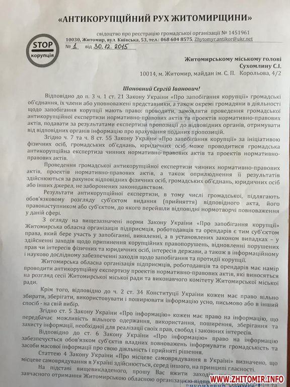 Натомість, починає діяти громадська організація «Антикорупційний Рух Житомирщини» і перший лист її голови Анатолія Борисова направлений меру Сергію Сухомлину: громадська організація пише про те, що Житомирська обласна організація підприємців, роботодавців та орендарів «має намір проводити антикорупційну експертизу проектів нормативно-правових актів, які виносяться на розгляд сесії Житомирської міської ради та виконавчого комітету Житомирської міської ради».