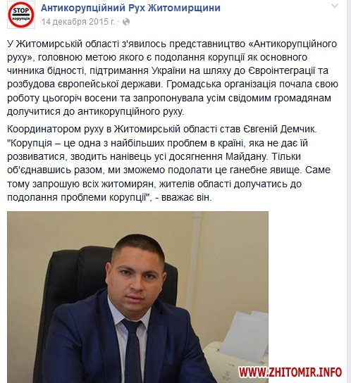 Приблизно в цей же час з’явилося повідомлення, що у Житомирській області є представництво «Антикорупційного руху» екс-голови СБУ Валентина Наливайченка, а координатором руху в області буде Євгеній Демчик. Проте, на офіційному сайті Антикорупційного руху жодних згадок ні про Демчика, ні про житомирський осередок знайти не вдалося.