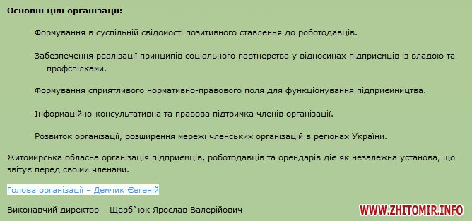 Здавалось би – який зв’язок між цими організаціями, а пов'язує їх Євгеній Демчик, який є головою Житомирської обласної організації підприємців, роботодавців та орендарів – так зазначено на сайті організації.