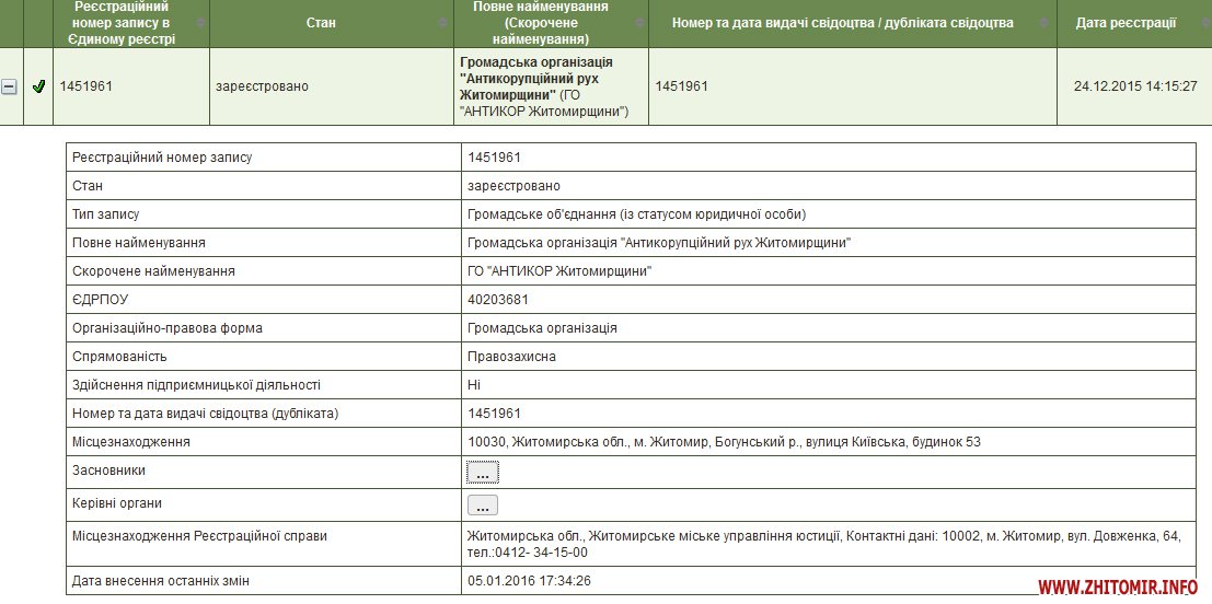 В реєстрі громадських організацій є інформація, що громадська організація «Антикорупційний Рух Житомирщини» зарестрована 24 грудня 2015 року, її засновники - Борисов Анатолій Валерійович та Демчик Євгеній Олександрович. Вони ж є «керівними органами»: Борисов – голова Правління, Демчик – перший заступник голови Правління.