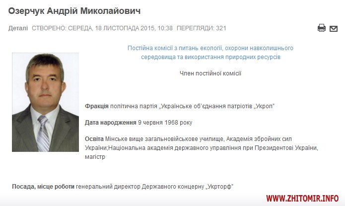 Генеральним директором концерну «Укрторф» є депутат Житомирської обласної ради Андрій Озерчук, який на місцевих виборах 2015 року був обраний від партії УКРОП в Лугинському районі. У попередньому складі обласної ради Озерчук входив до фракції ВО «Батьківщина». На парламентських виборах 2014 року Андрій Озерчук балотувався по Коростенськму округу №64 від партії «Народний фронт».