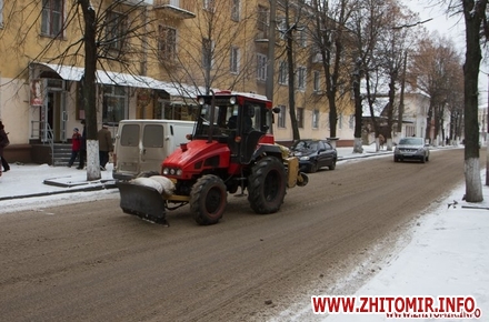 У Житомирі 25 січня дороги та вулиці міста розчищали 12 одиниць техніки, в тому числі й самосвали, піскорозсипачі, погрузчик та грейдер.