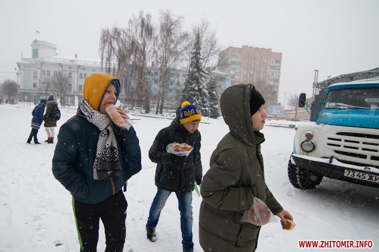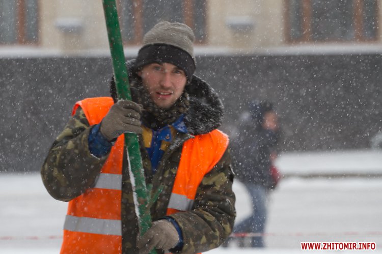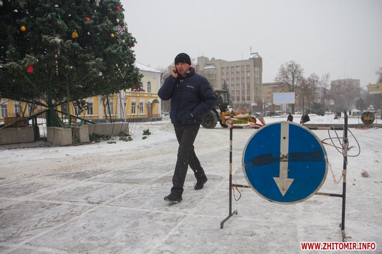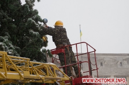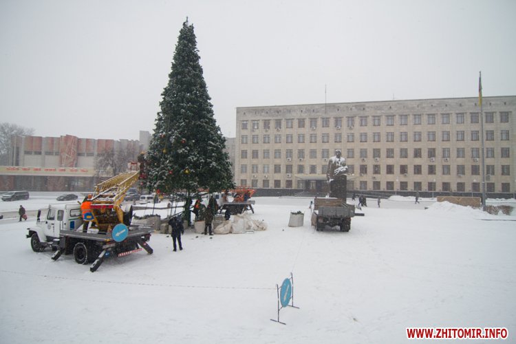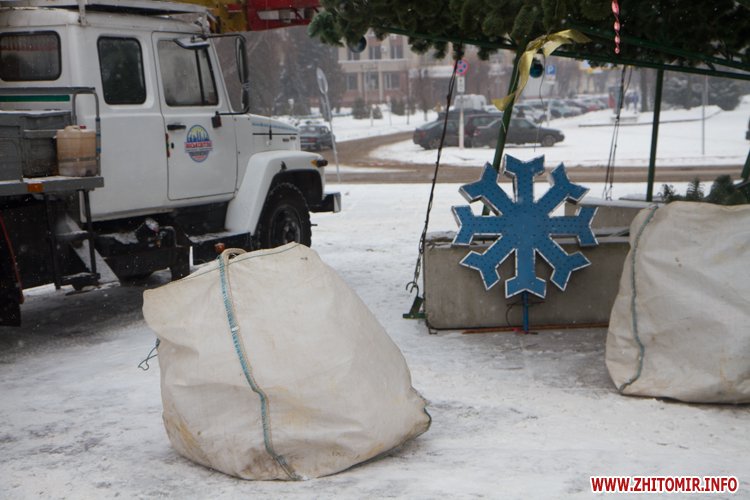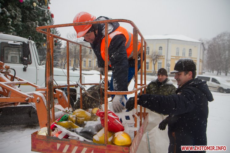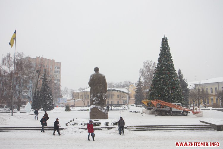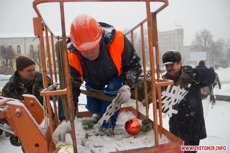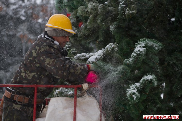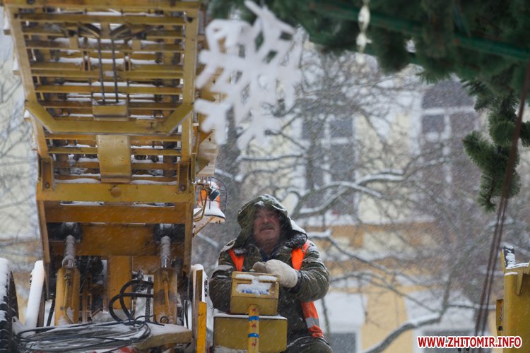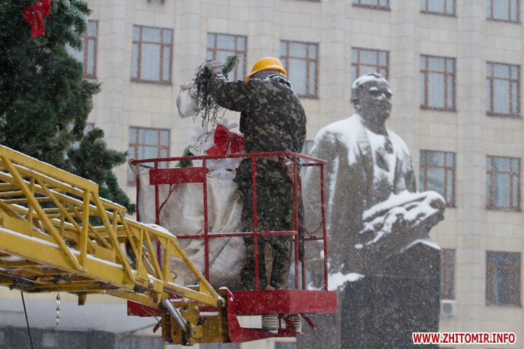 У Житомирі 25 січня сніговій, а у комунальників відповідальна робота: вони розбирають головну ялинку на майдані Корольова.