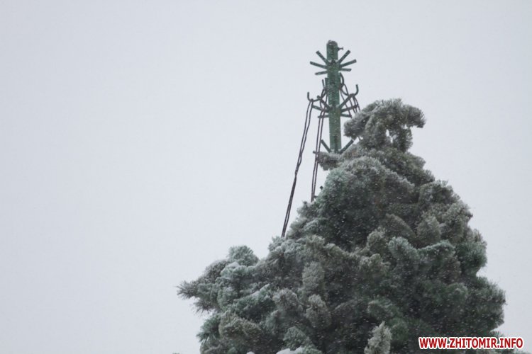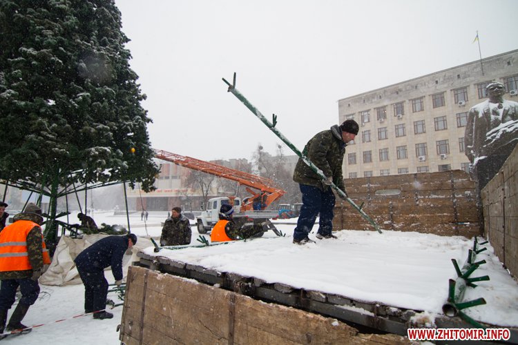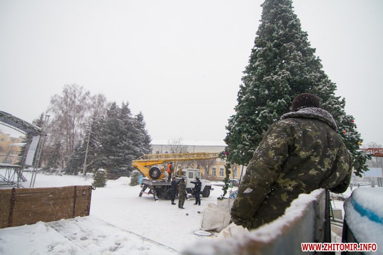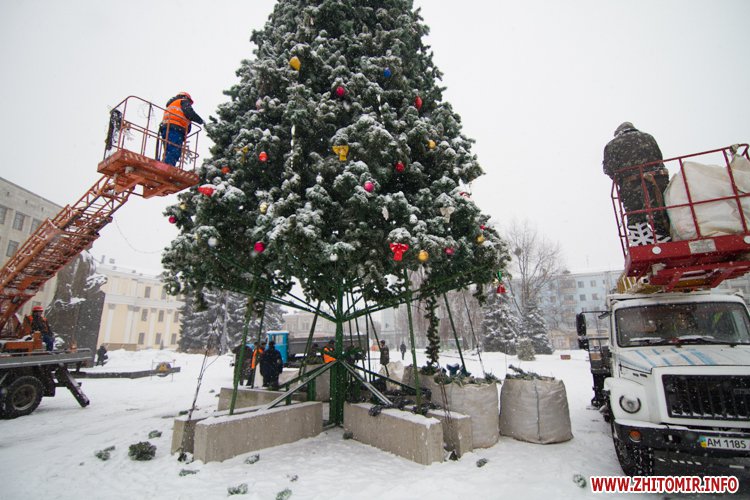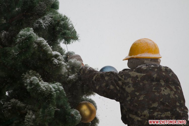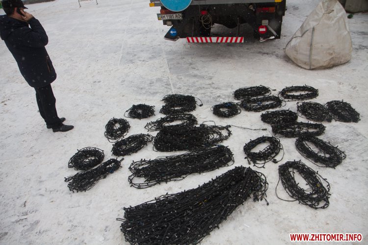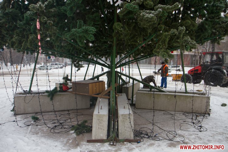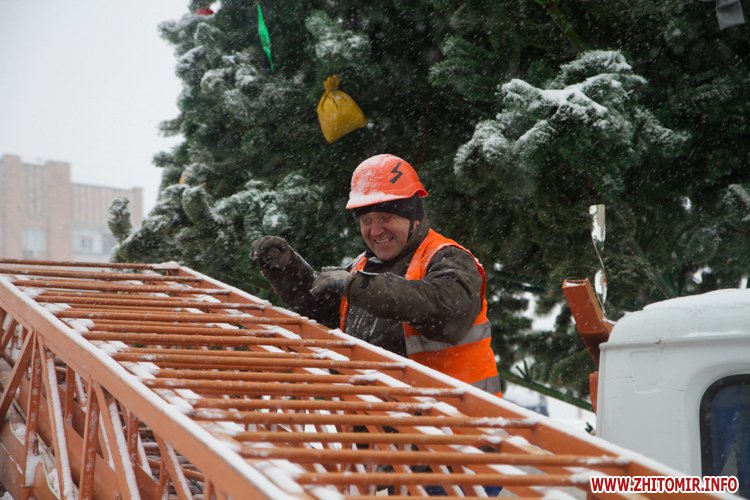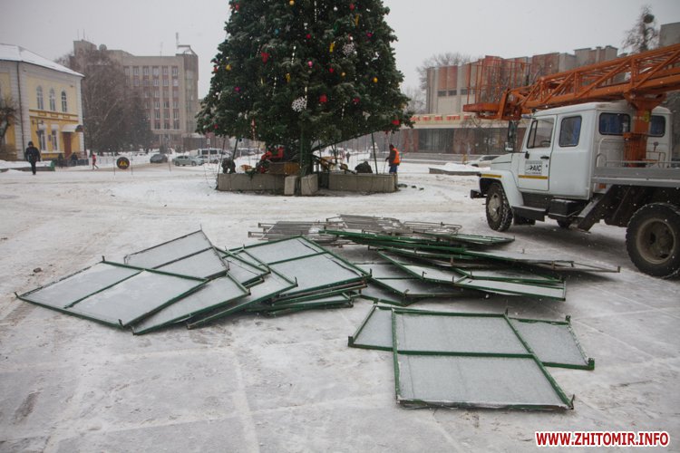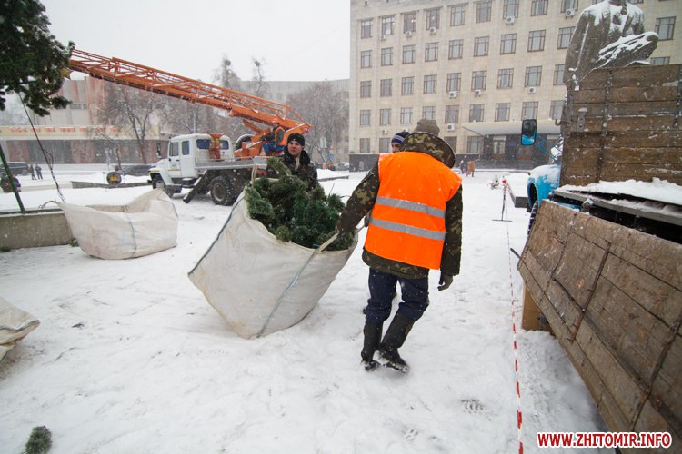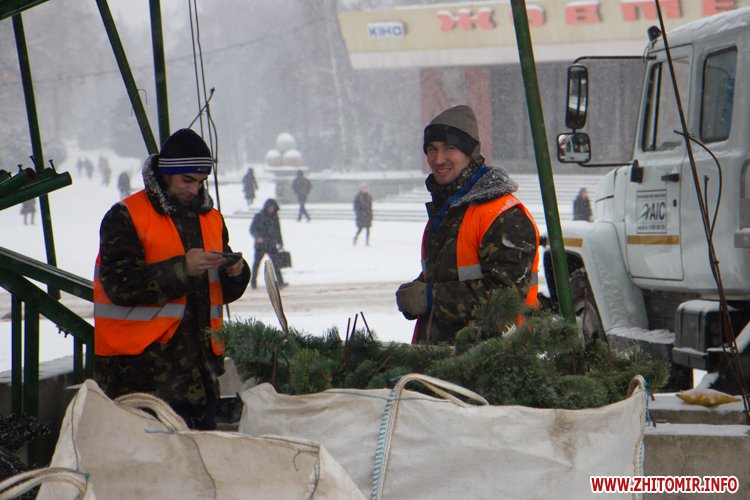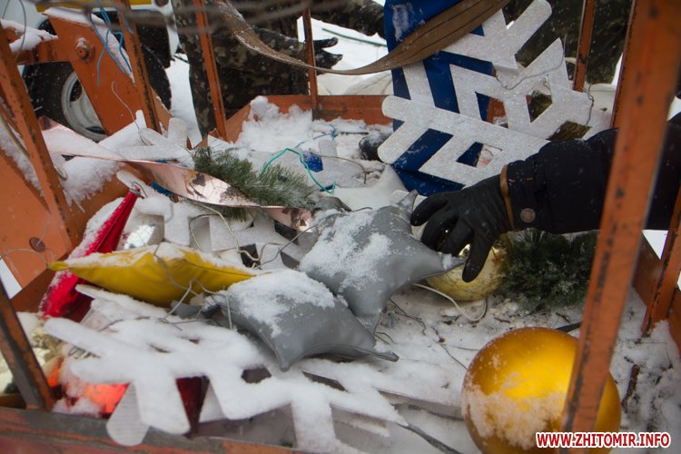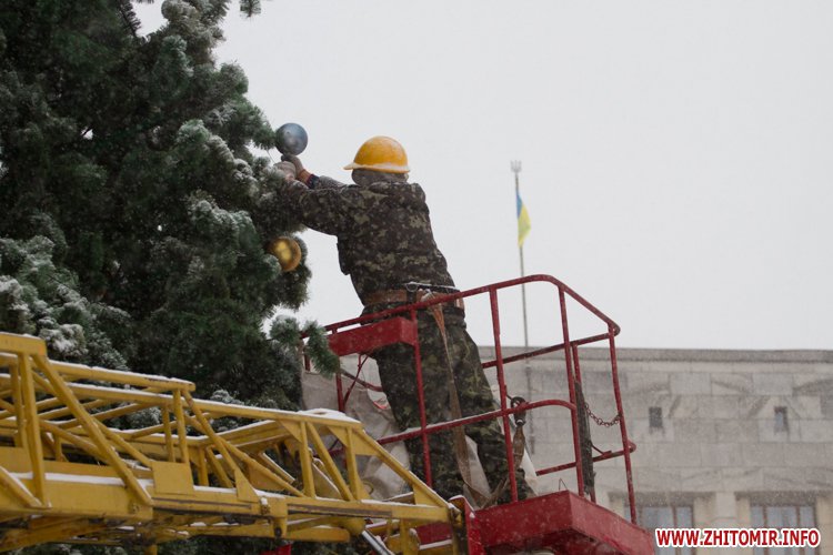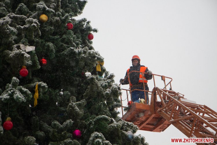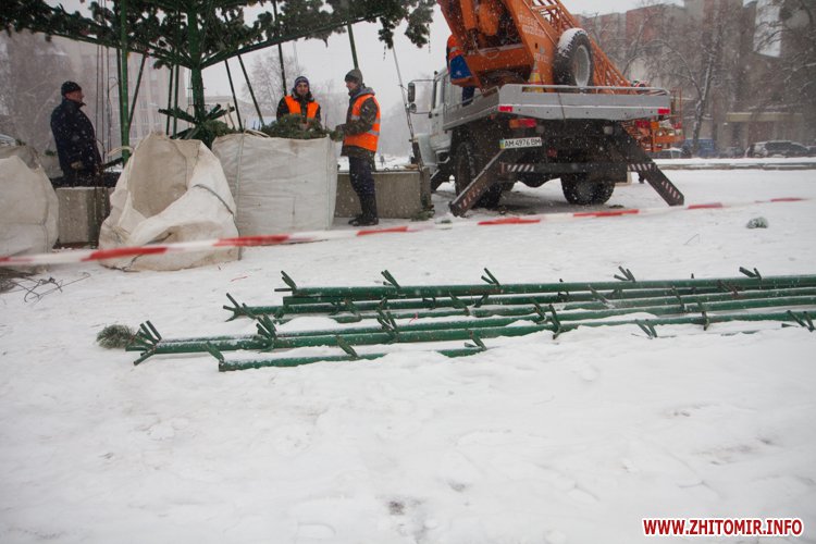 Працівники «Міськсвітла» у першій половині дня зняли гірлянди та іграшки, розібрали щити навколо, а далі почали демонтувати верхівку. Гірлянди у вигляді снігових крапель на деревах довкола знімуть насамкінець. Зазвичай демонтаж новорічної красуні в Житомирі триває 2-3 дні.