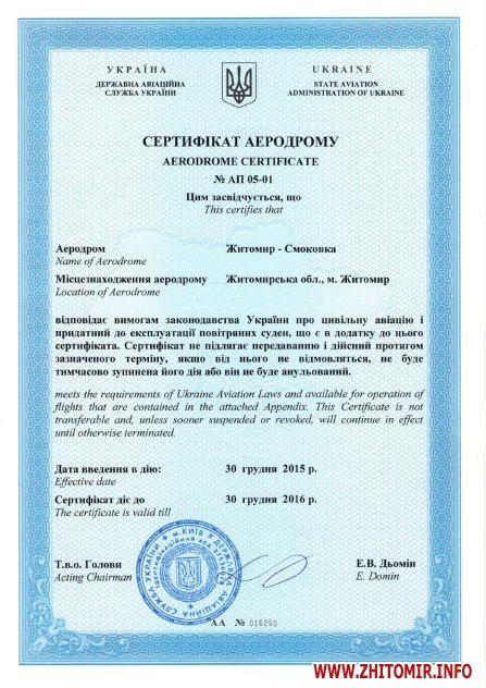 Как сообщал Житомир.info, 24 апреля 2015 года было выдано свидетельство о регистрации аэродрома «Житомир-Смоковка», а 30 декабря – сертификат аэродрома, такой же, как у аэропортов «Борисполь» и «Жуляны».