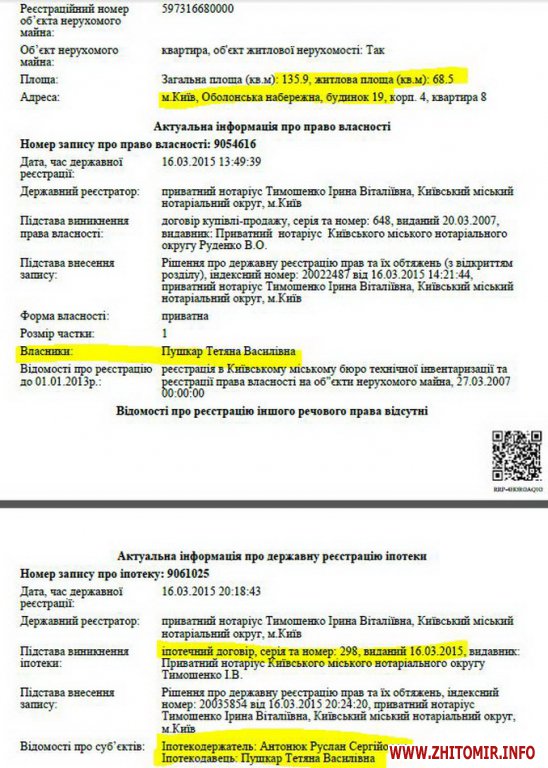«Йдеться про квартиру загальною площею 135,9 кв м на Оболонській набережній, 19 (будинок на фото). Згідно з даними витягу, Антонюк став іпотекодержателем на це майно у березні 2015 року. Власником квартири є Тетяна Пушкар, свого часу приписана за однією адресою з Олександром Зейканом, екс-очільником Департаменту з видобутку нафти й газу НАК «Нафтогаз» та екс-радником Сергія Кацуби як народного депутата, а нині гендиректором ДП «Укргеофізика». За даними ріелторських сайтів, наразі квартири в цьому будинку продають по ціні $3-4 тис за квадрат, зокрема квартири в цьому будинку з ідентичною площею коштують до $515 тис, або близько 13 млн грн. за офіційним курсом НБУ», - йдеться в публікації.