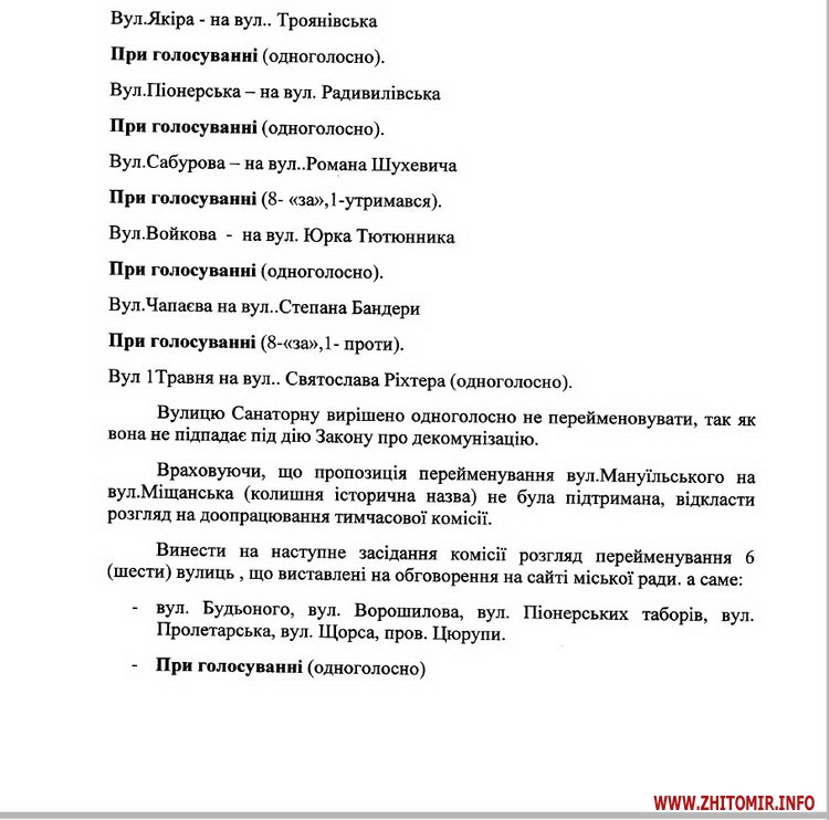 «Вулицю Санаторну вирішено одноголосно не перейменовувати, так як вона не підпадає під дію Закону про декомунізацію. Враховуючи, що пропозиція перейменування вул. Мануїльського на вул. Міщанська (колишня історична назва) не була підтримана, відкласти розгляд на доопрацювання тимчасової комісії», – йдеться в протоколі.