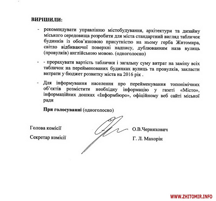 «Рекомендували управлінню містобудування, архітектури та дизайну міського середовища, розробити для міста стандартний вигляд табличок будинків із обов’язковою присутністю на ньому герба Житомира, світло відбиваючої поверхні надпису, дублювання назв вулиць (провулків) англійською мовою. Прорахувати вартість таблички і загальну суму витрат на заміну всіх табличок на перейменованих будинках вулиць та провулків, закласти витрати у бюджет розвитку міста на 2016 рік», – вирішили члени комісії.