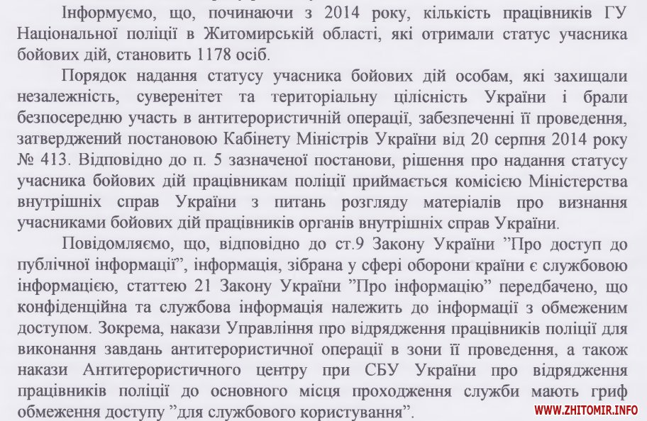 «Інформуємо, що, починаючи з 2014 року, кількість працівників ГУ Національної поліції в Житомирській області, які отримали статус учасника бойових дій, становить 1178 осіб», - йдеться у відповіді за підписом заступника начальника Миколи Юсковця.