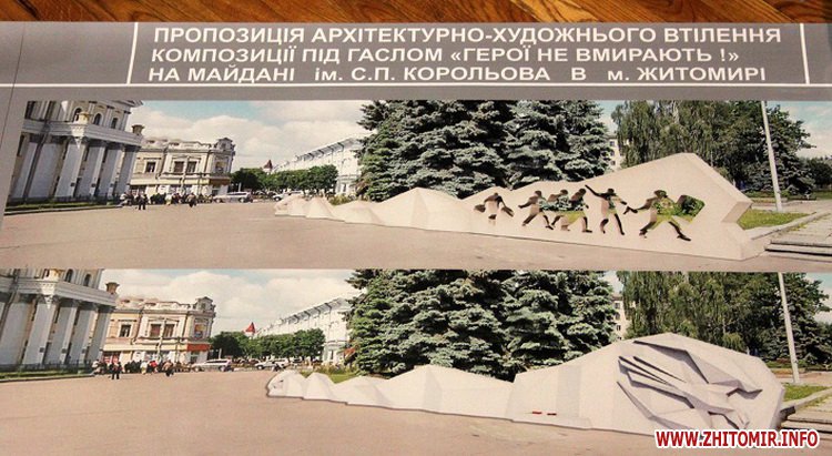 «На конкурс було подано три пропозиції – всі з розміщенням на майдані ім. С. П. Корольова. Журі одноголосно прийняло рішення на користь проекту «Герої не вмирають» авторів Герез-Гладка Юлія та Герез Петро. Раніше цей проект було визнано найкращим під час бліц-конкурсу, організованого Житомирською міською радою. Однією з беззаперечних переваг проекту-переможця є готовність всієї проектно-кошторисної документації та необхідних креслень. Це дасть можливість розпочати роботи негайно і завершити в найкоротші терміни», – йдеться в повідомленні.