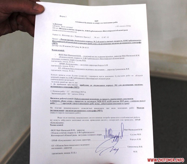Як повідомляв Житомир.info, під час сесії обласної ради 10 вересня цього року начальник управління охорони здоров’я Олександр Торбас говорив про те, що приміщення у відділенні, яке збудоване під МРТ за кошти обласного бюджету, здали в оренду на 10 років приватній фірмі. Тоді ж голова облради Віталій француз доручив юристам опрацювати питання про розірвання угоди оренди приміщення. В жовтні президія обласної ради погодила виділення 868 тис. грн. на будівництво приміщення в обласній клінічній лікарні ім. О. Ф. Гербачевського для встановлення комунального магнітно-резонансного томографа. За виділення грошей депутати проголосували на сесії 15 жовтня 2015 року. У грудні 2015 року громадськість запевнили, що МРТ може бути встановлений у лютому 2016 року.