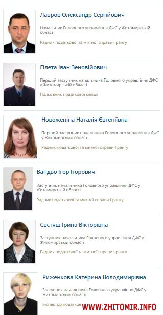 Керівництво ГУ ДФС в Житомирській області станом на 4 лютого 2016 року. Скрін-копія з офіційного сайту управління: