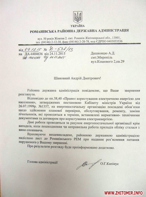 Він демонструє переписку свого колеги по селищній раді Андрія Дашковця з Романівським районом електромереж, Романівською райдержадміністрацією, ПАТ «Житомироблернерго» і Романівською районною прокуратурою. Відповіді схожі на відписки на кшталт «усе правильно, так і має бути».